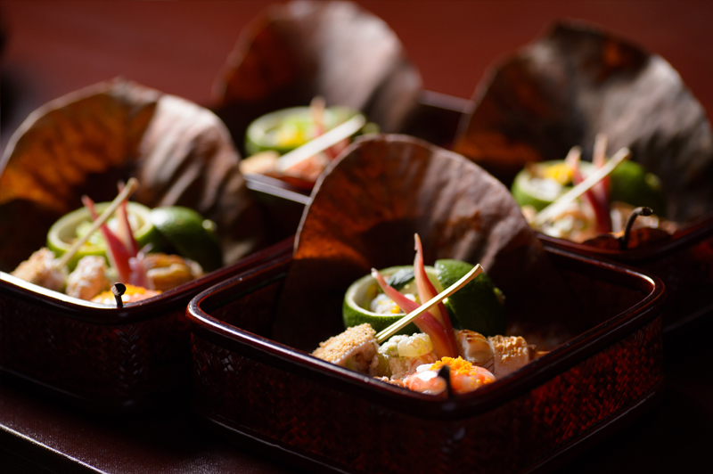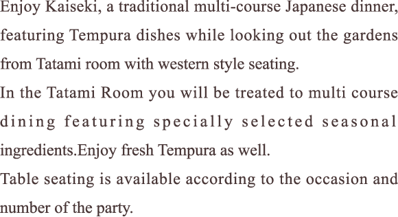 Enjoy Kaiseki, a traditional multi-course Japanese dinner, featuring Tempura dishes while looking out the gardens from Tatami room with western style seating. In the Tatami Room you will be treated to multi course dining featuring specially selected seasonal ingredients. Enjoy fresh Tempura as well.